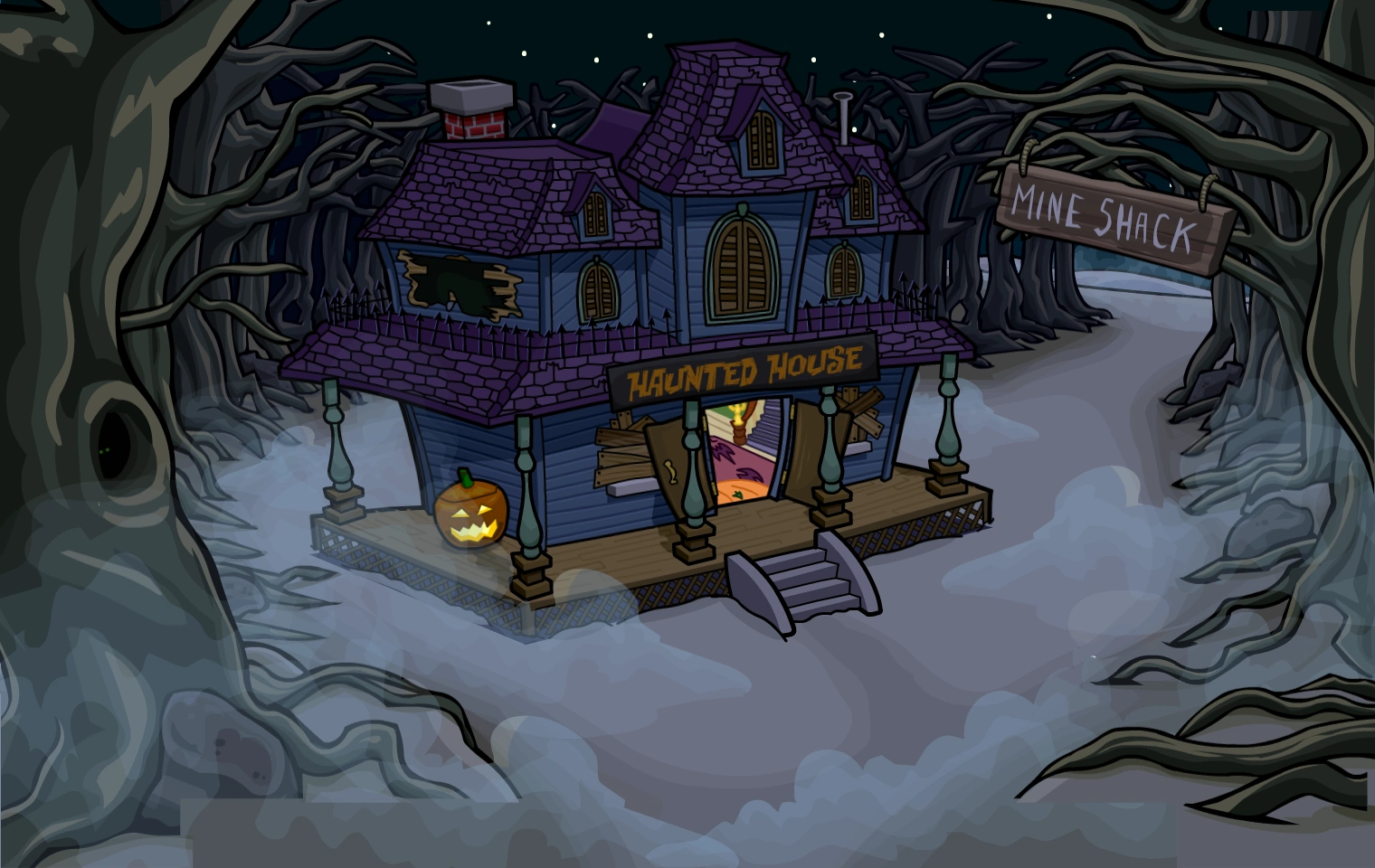 The Haunted House Entrance is a party room located in the Forest on Club Penguin Journey. It was first released during the Halloween Party 2023.